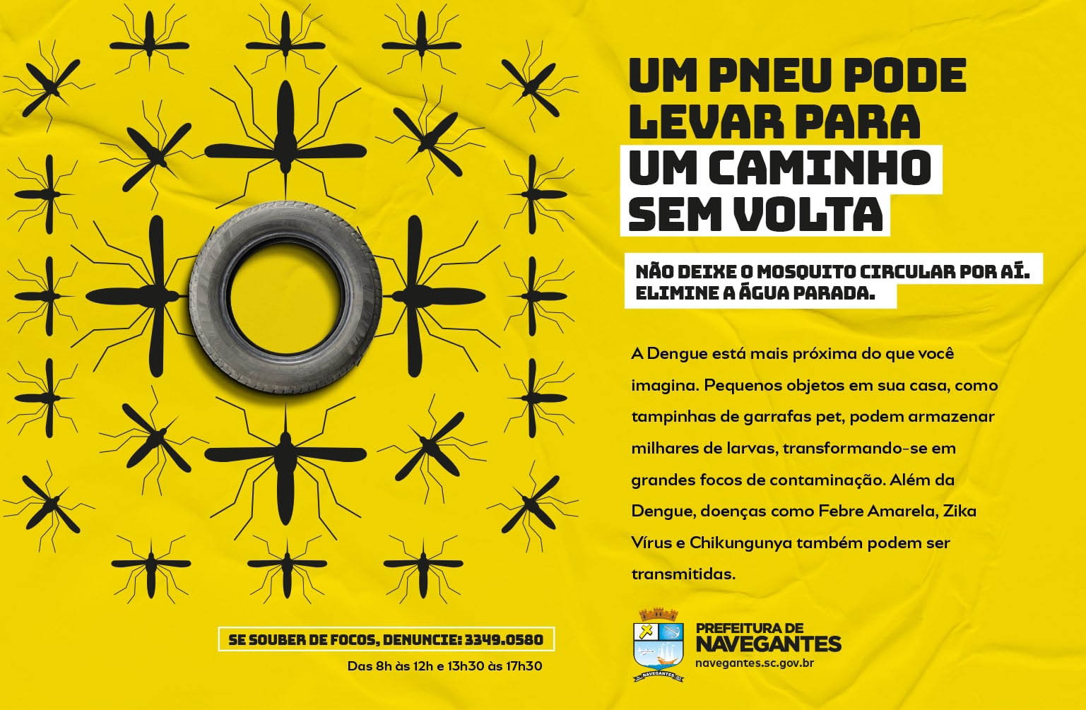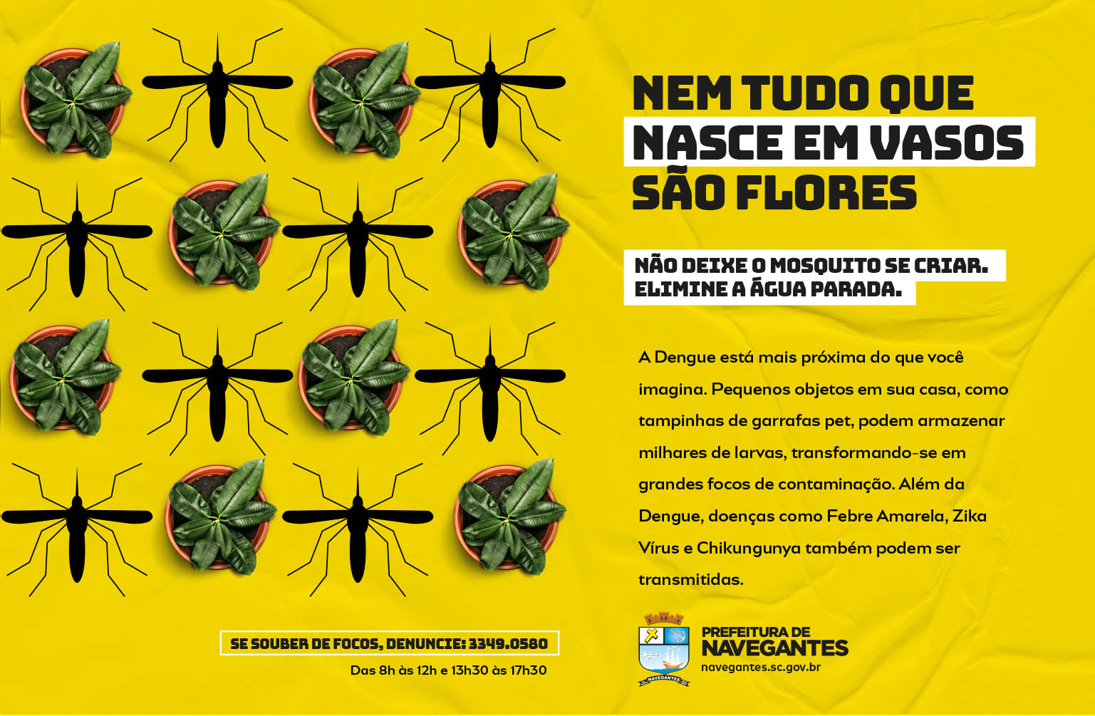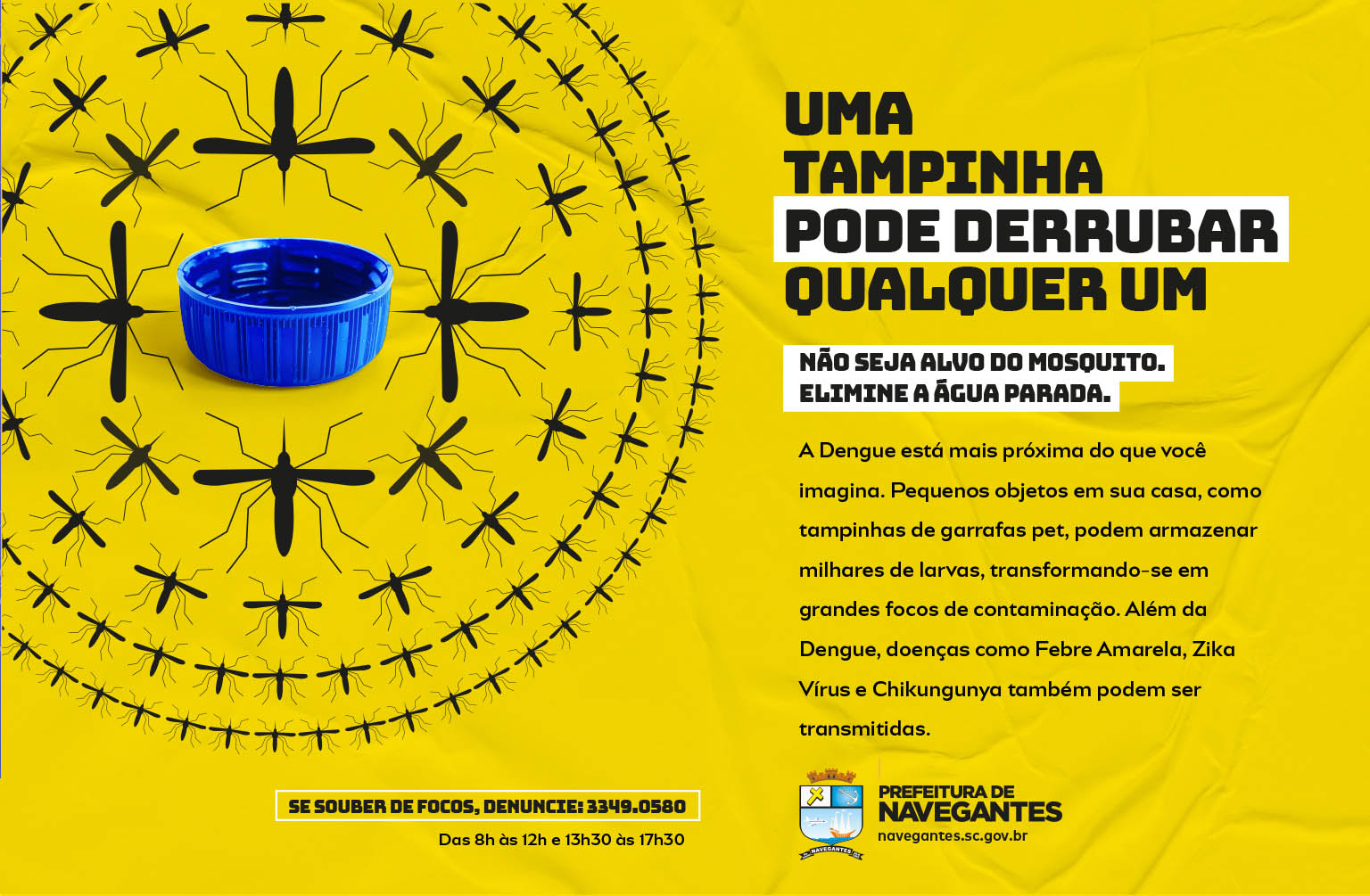 | Resumo do Desafio e da Solução: Diante do aumento nos números de focos positivos de larvas do mosquito da Dengue na cidade, a campanha visou comunicar a importância da prevenção da proliferação do mosquito transmissor, o Aedes aegypti, em Navegantes. A campanha foi criada com o objetivo de promover o envolvimento da comunidade no combate aos focos, a partir de conceito criativo inteligente, com roteiros, layouts e chamadas impactantes. |