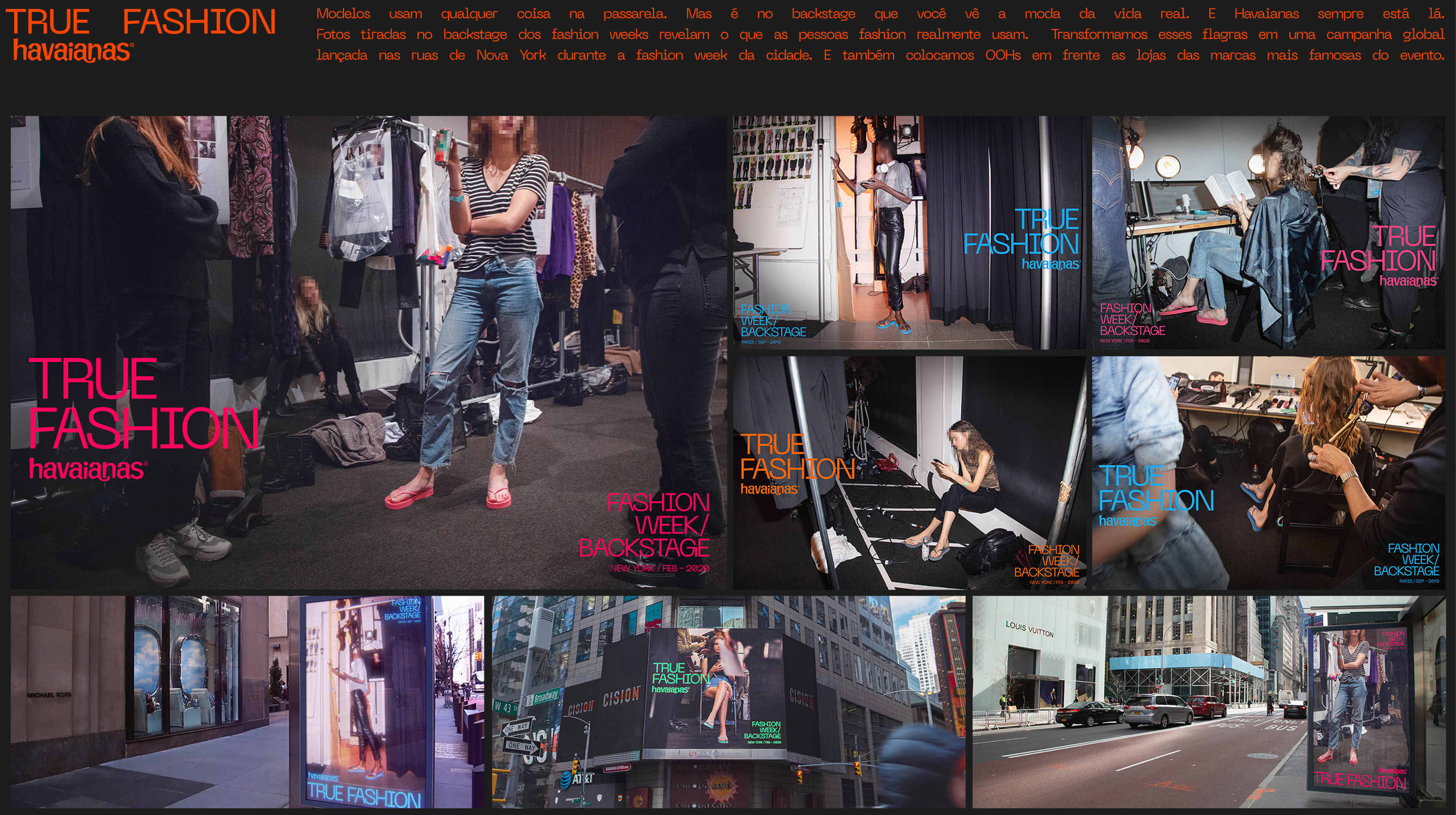 | Resumo do Desafio e da Solução: Modelos usam qualquer coisa na passarela. Mas é no backstage que você vê a moda da vida real. E Havaianas sempre está lá.Fotos tiradas no backstage dos fashion weeks revelam o que as pessoas fashionrealmente usam. Transformamos esses flagras em uma campanha globallançada nas ruas de Nova York durante a fashion week da cidade. E também colocamos OOHs em frente as lojas das marcas mais famosas do evento. |