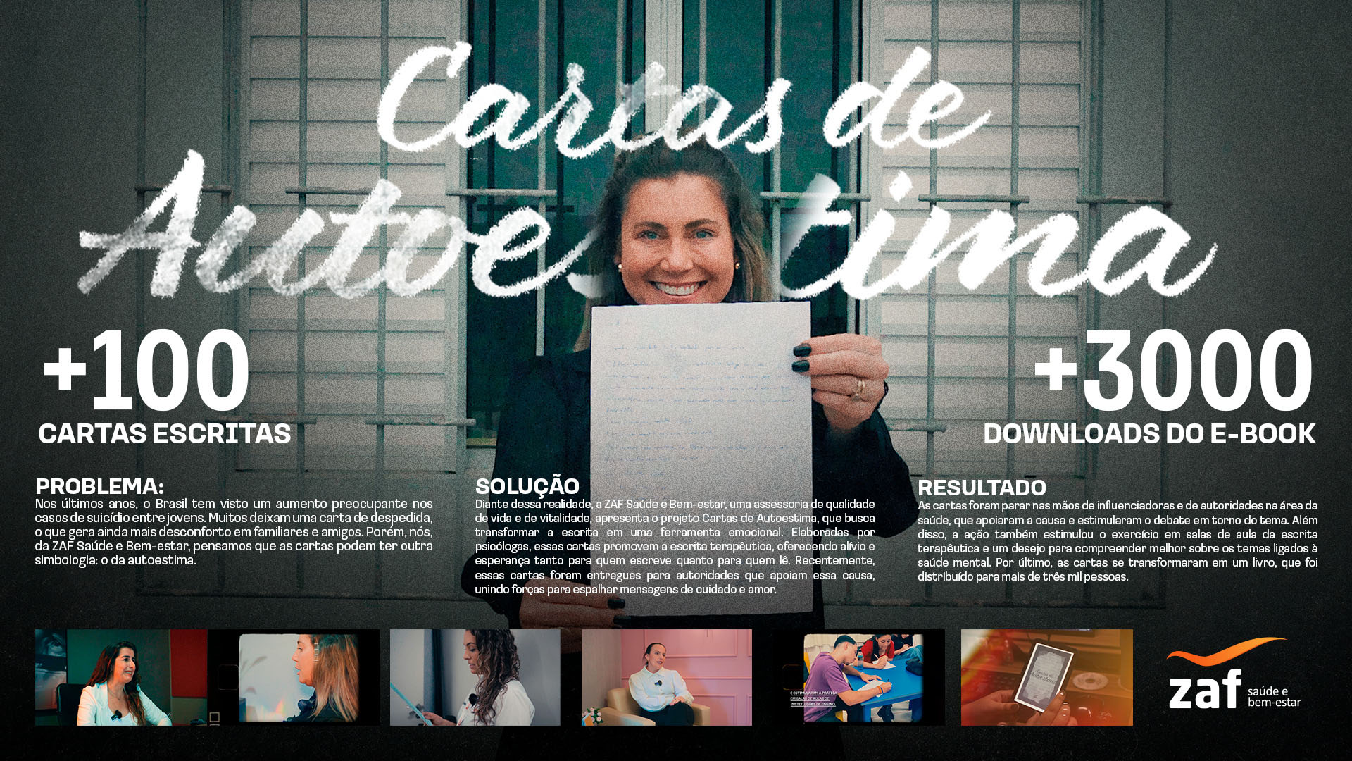 | Resumo do Desafio e da Solução: Nos últimos anos, o Brasil tem visto um aumento preocupante nos casos de suicídio entre jovens. Diante dessa realidade, a Zaf apresenta o projeto Cartas de Autoestima, que busca transformar a escrita em uma ferramenta de bem-estar emocional. Elaboradas por psicólogas, essas cartas promovem a escrita terapêutica, oferecendo alívio e esperança tanto para quem escreve quanto para quem lê. |