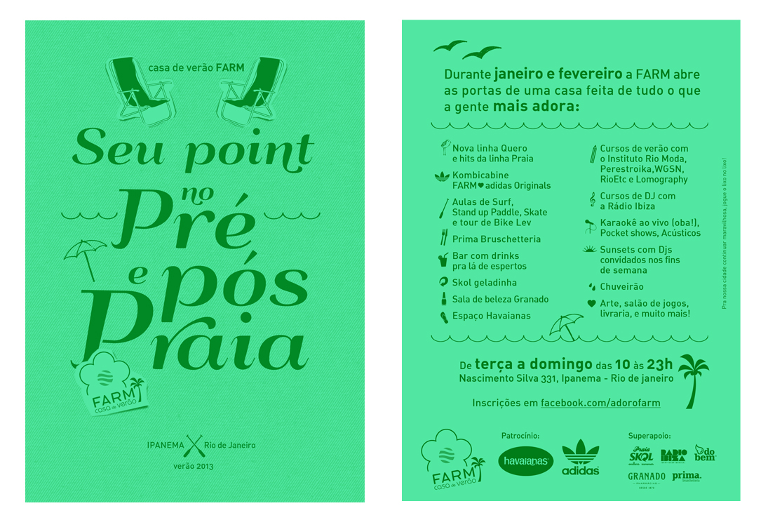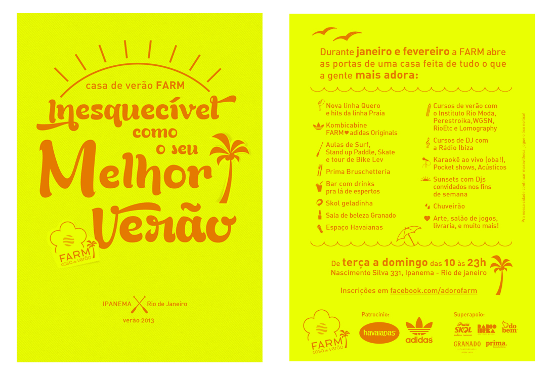 FICHA TÉCNICA: Direção de Criação: André Carvalhal e Fernanda Motta. Planejamento: Fernanda Motta. Luciane Coutinho e Marianna Borges. Direção de Arte: Equipe de Visual e Merchandising Farm. Fotografia/Ilustração: I Hate Flash. Produtora de Áudio: Rádio Ibiza. WebDesign: Farm. Cursos: Perestroika, Instituto Rio Moda e Rio Etc.. Esportes: Sup Classic, Piriquito Sk8, Soul Rio Surf e Lev.. Apoio: do Bem, Adidas, Gnt, Fom, Oppa, Fotocabine, Be. Bo., Lomography, Glamour.. Mídia: GNT. Atendimento: Marianna Borges. Aprovação: André Carvalhal e Fernanda Motta.