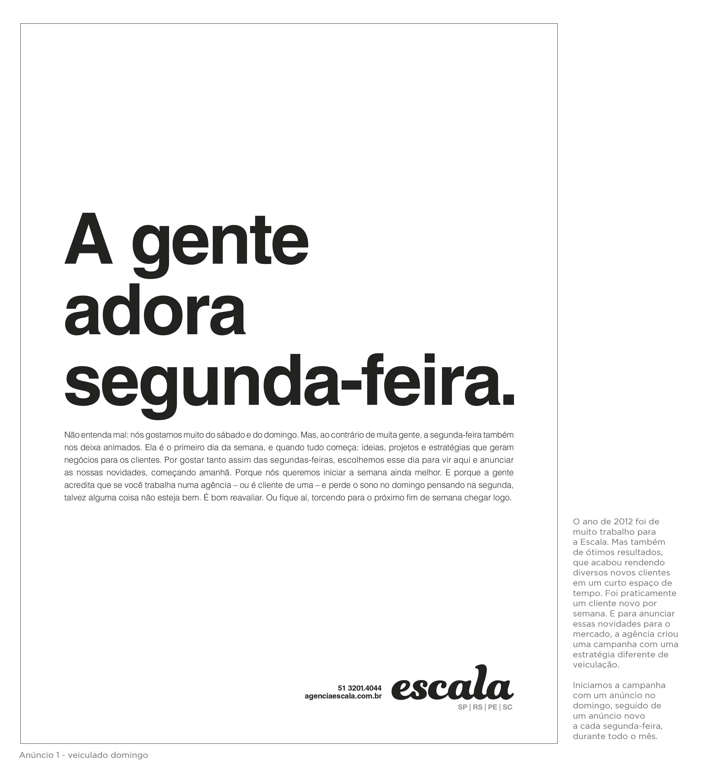 FICHA TÉCNICA: Direção de Criação: Hugo Novaes e Régis Montagna. Planejamento: João Miragem. Redação: Juliano Faerman. Direção de Arte: Jacques Fernandes. Produção Gráfica: Maristela Mello e Pedro Freitas. Fotografia/Ilustração: Celso Chittolina. Estúdio/Manipulação: Miagui. Mídia: Renata Schenkel e Márcio Marchiori. Atendimento: Lia Pinheiro e Andrea Klemm. Aprovação: Edson Busin. |
