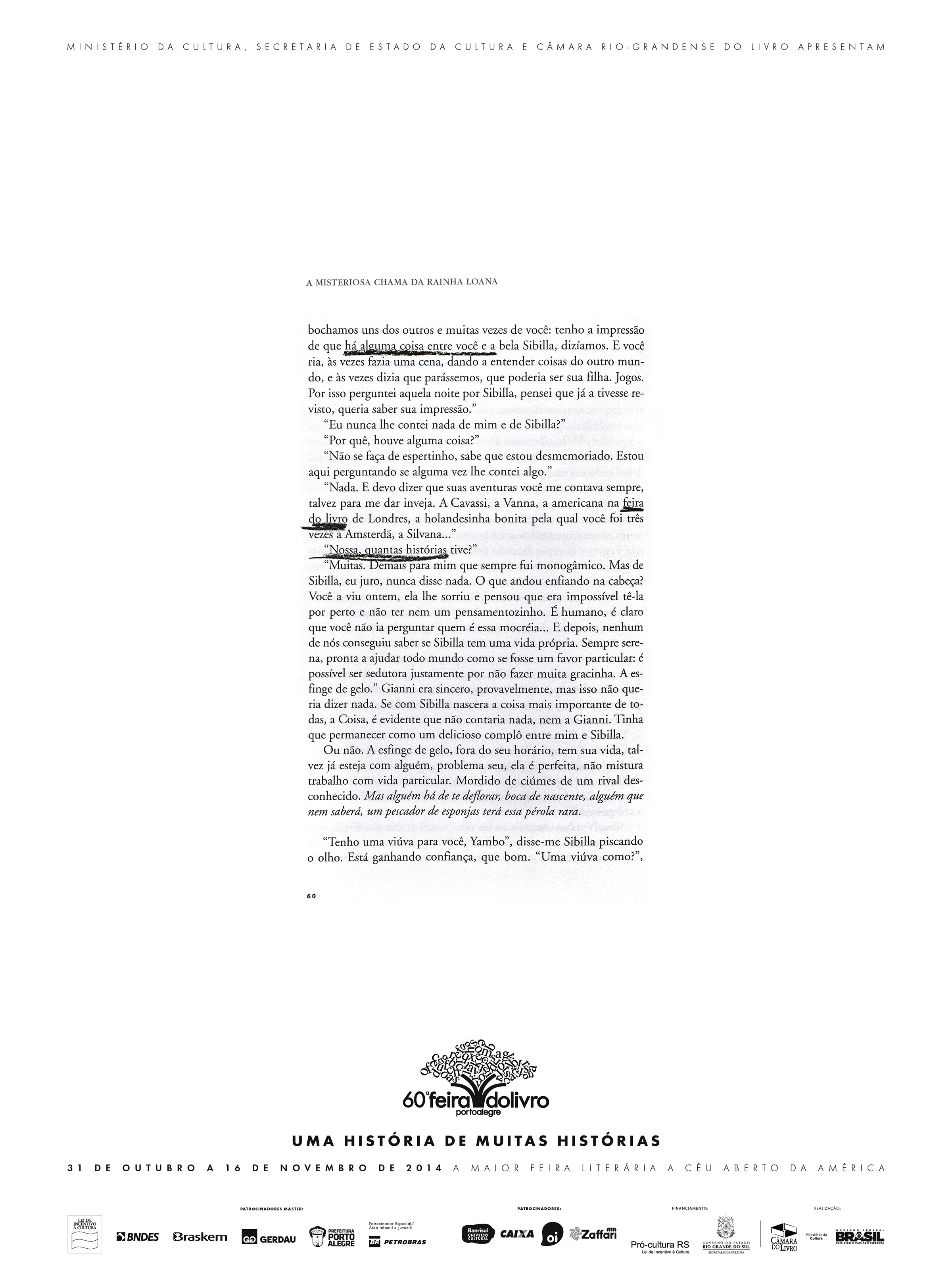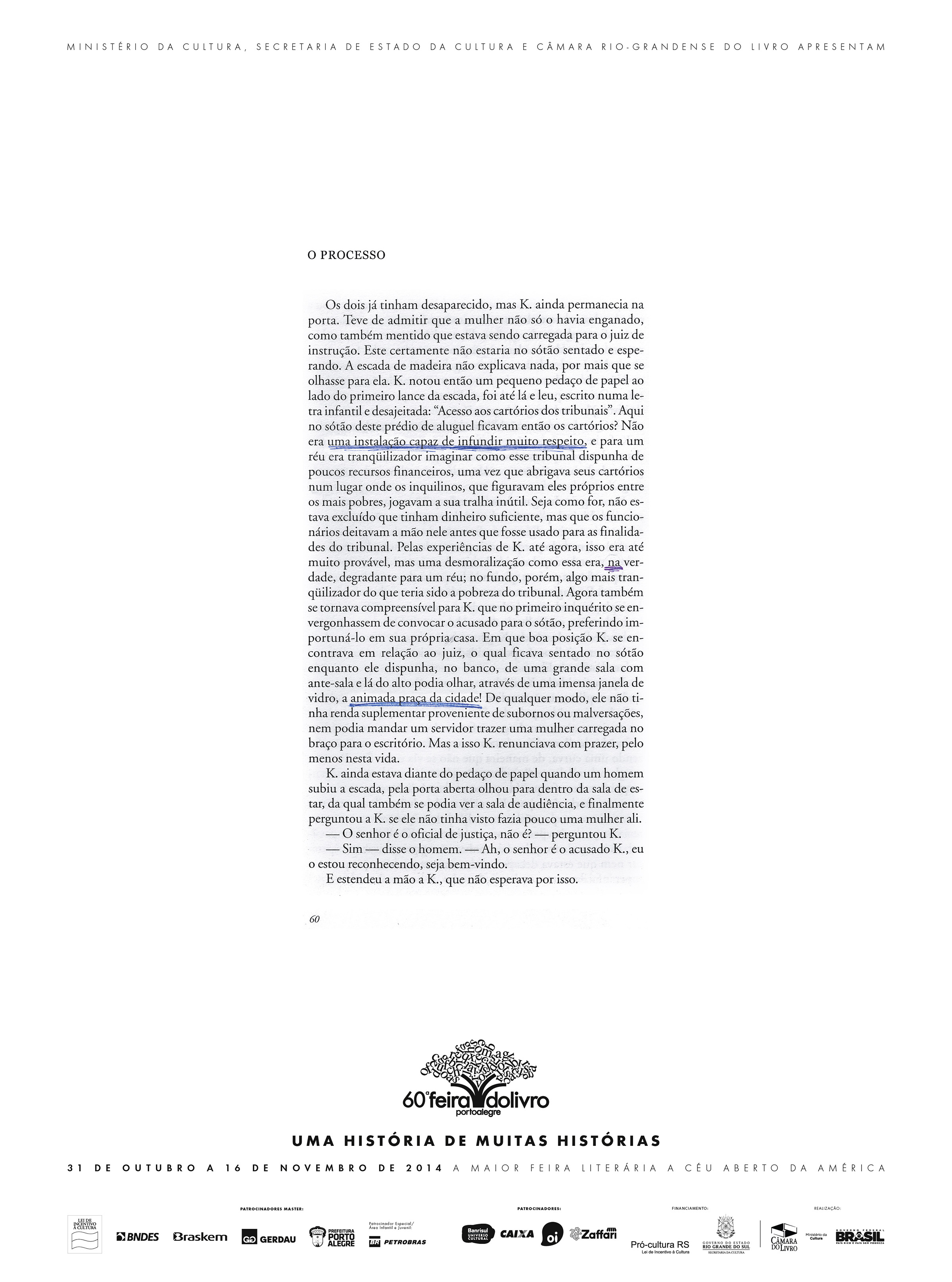 FICHA TÉCNICA: Direção de Criação: Diego Wortmann. Planejamento: José Lucas de Paula, Juliana Maaz e Mariana Prado. Redação: Rodrigo Rocha. Direção de Arte: Diego Vieira. Produção Gráfica: Marcia Lacaze e Ana Melo. Mídia: Camila Rodrigues e Lucas Cavalcante. Atendimento: Fernanda Knijnik, Camila Roveda e Fabrício Soares. Estúdio de Fotografia: Letícia Remião Estúdio. Fotógrafo: Letícia Remião. Ilustrador: Diego Vieira. Manipulação Digital: Ação Produção e Comunicação Ltda.. Aprovação: Marcos Grespan e Rosane Fantinelli. |