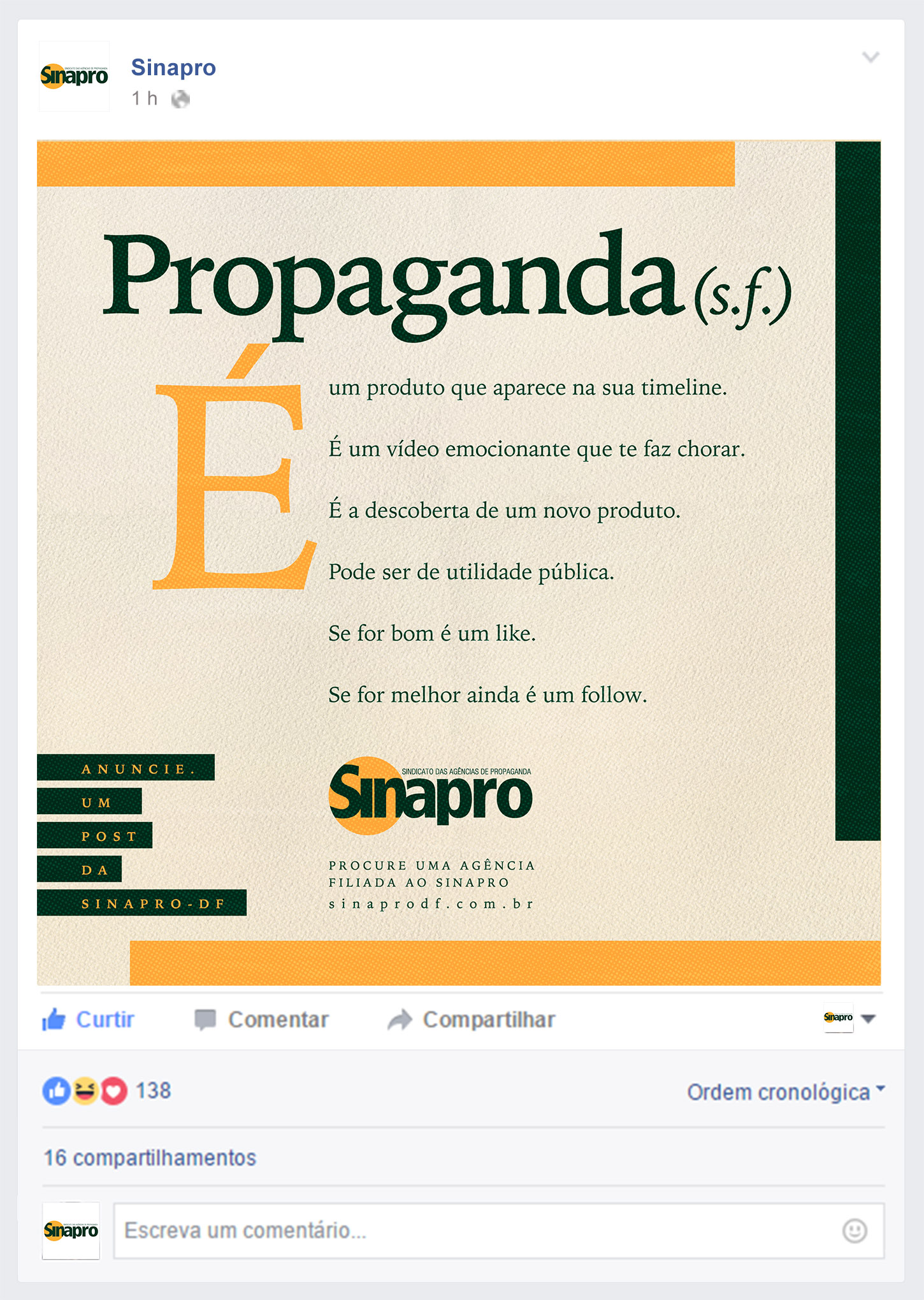 FICHA TÉCNICA: Direção de Criação: Cco: Felipe Luchi / Diretora de Criação: Geisa Lopes. Planejamento: Cso: Renata Serafim / Gisele Padovan. Redação: Paulo Mello e Thiago Rezende. Direção de Arte: Dudu Servan e Paulo Mariano. Produção Gráfica: Flavia Valadares. Produção de RTVC: Patricia Gaglioni e Stella Gafo. Tecnologia Digital: Marcela Morais. Coo: Wilson Negrini. Chairman: Luiz Lara / Diretora Geral de Brasília: Kika Cardoso. Mídia: Milena Lima,Jean Lima, Alan Gonçalves e Iago Joston. Atendimento: Rianni Bertoldo e Daniela Rios. Produtora de Filme: Spray Filmes. Direção do Filme: Rodrigo Moreira. Produtora de Áudio: Mugshot. Aprovação: Alexandre Alves, Karen Machado, Elvis Kleber,Fabio Cunha e Thais Oliveira. |