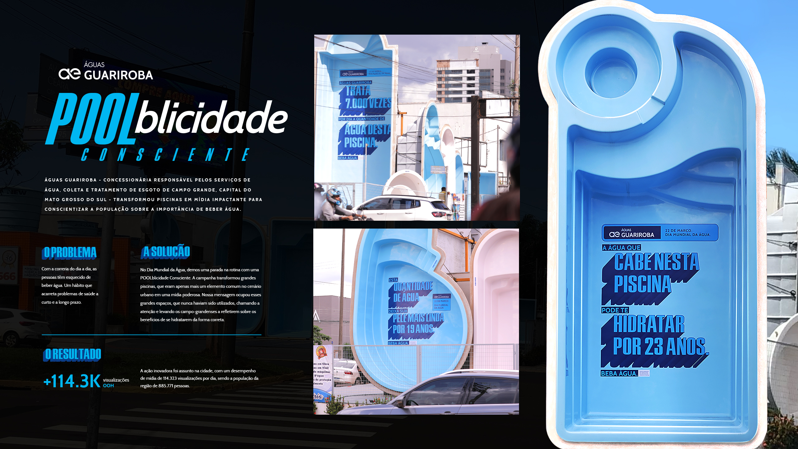 | Resumo do Desafio e da Solução: No Dia Mundial da Água, a Águas Guariroba ajudou os campo-grandenses a lembrarem de se hidratar, mas de um jeito diferente: usando lojas de piscina como mídia. Nada como um grande lembrete para mudar um pequeno hábito. |