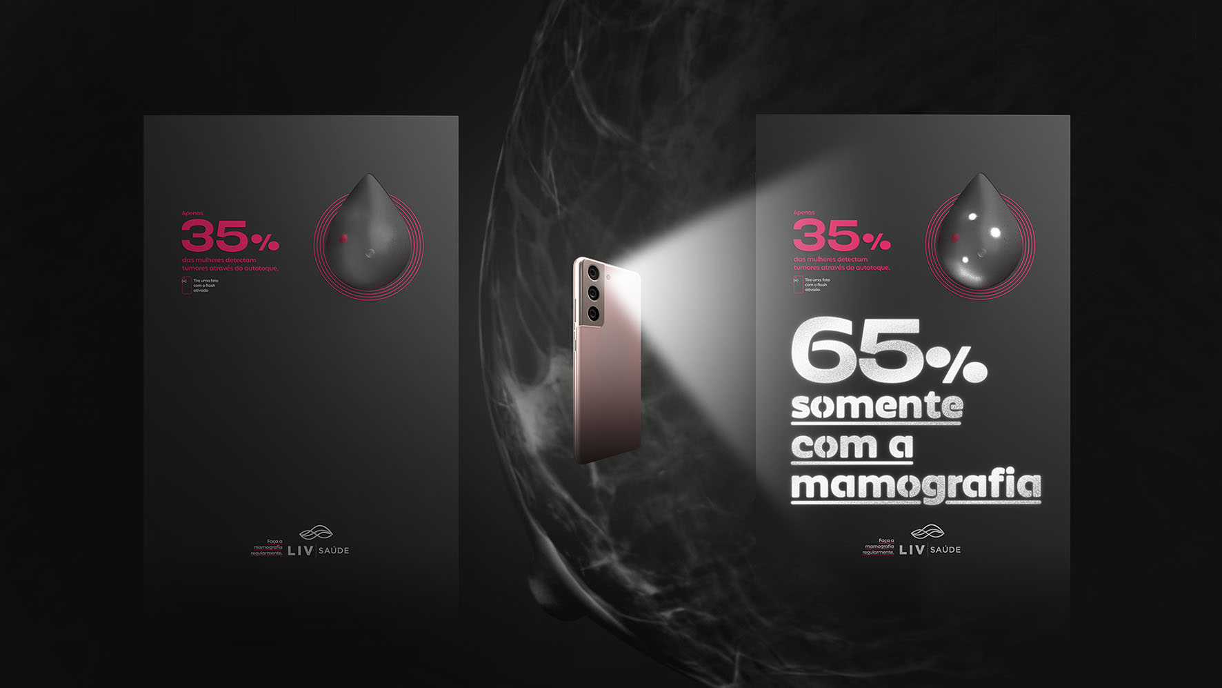 | Resumo do Desafio e da Solução: Para que o público tivesse a experiência da diferença entre o exame de toque e a mamografia, pensamos em um totem que contivesse uma prótes, em que fosse possível tocar e sentir a presença do nódulo. Mas, usando de tinta refletiva, apenas com o flash ativado do celular seria possivel ver a verdadeira mensagem. |