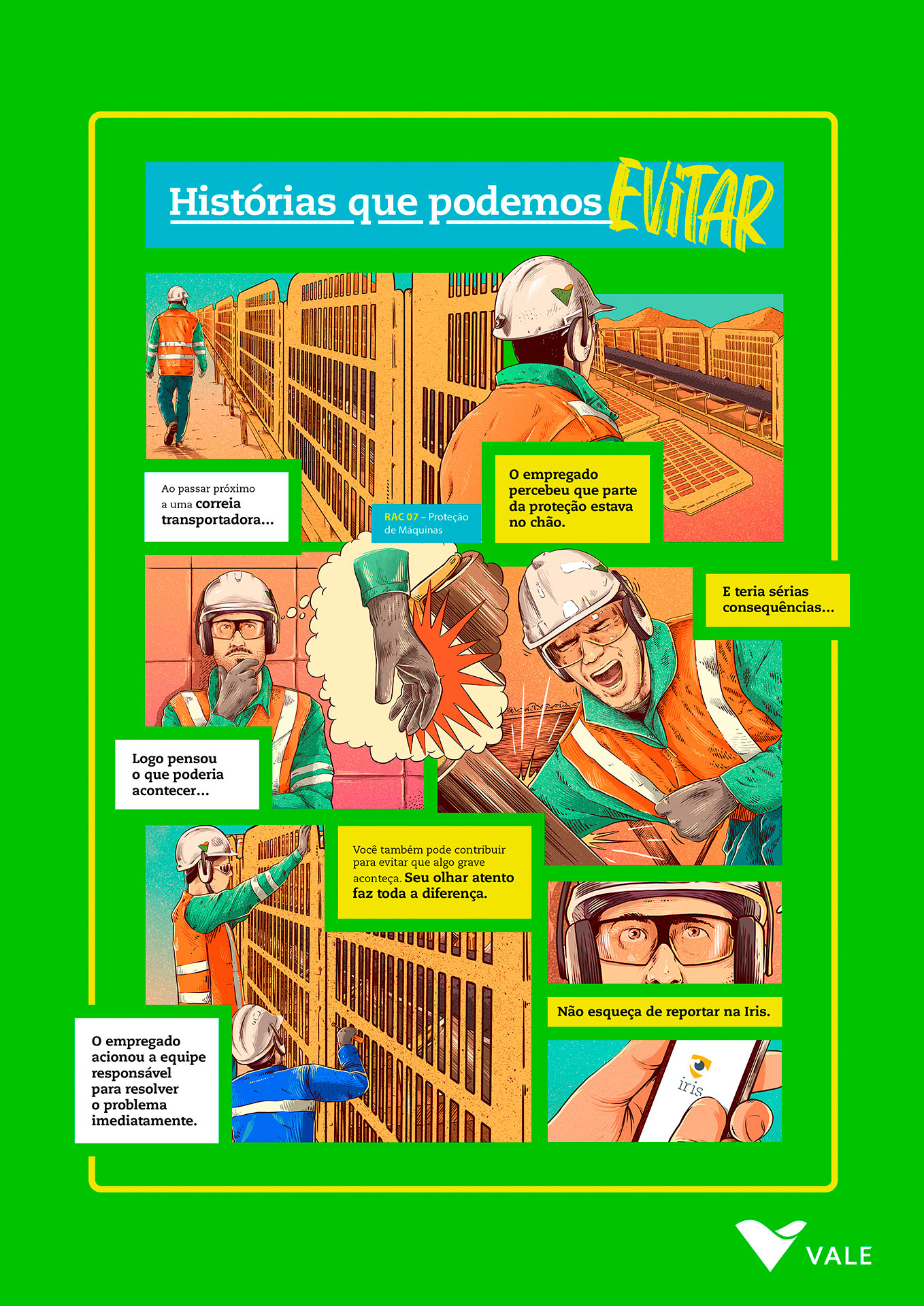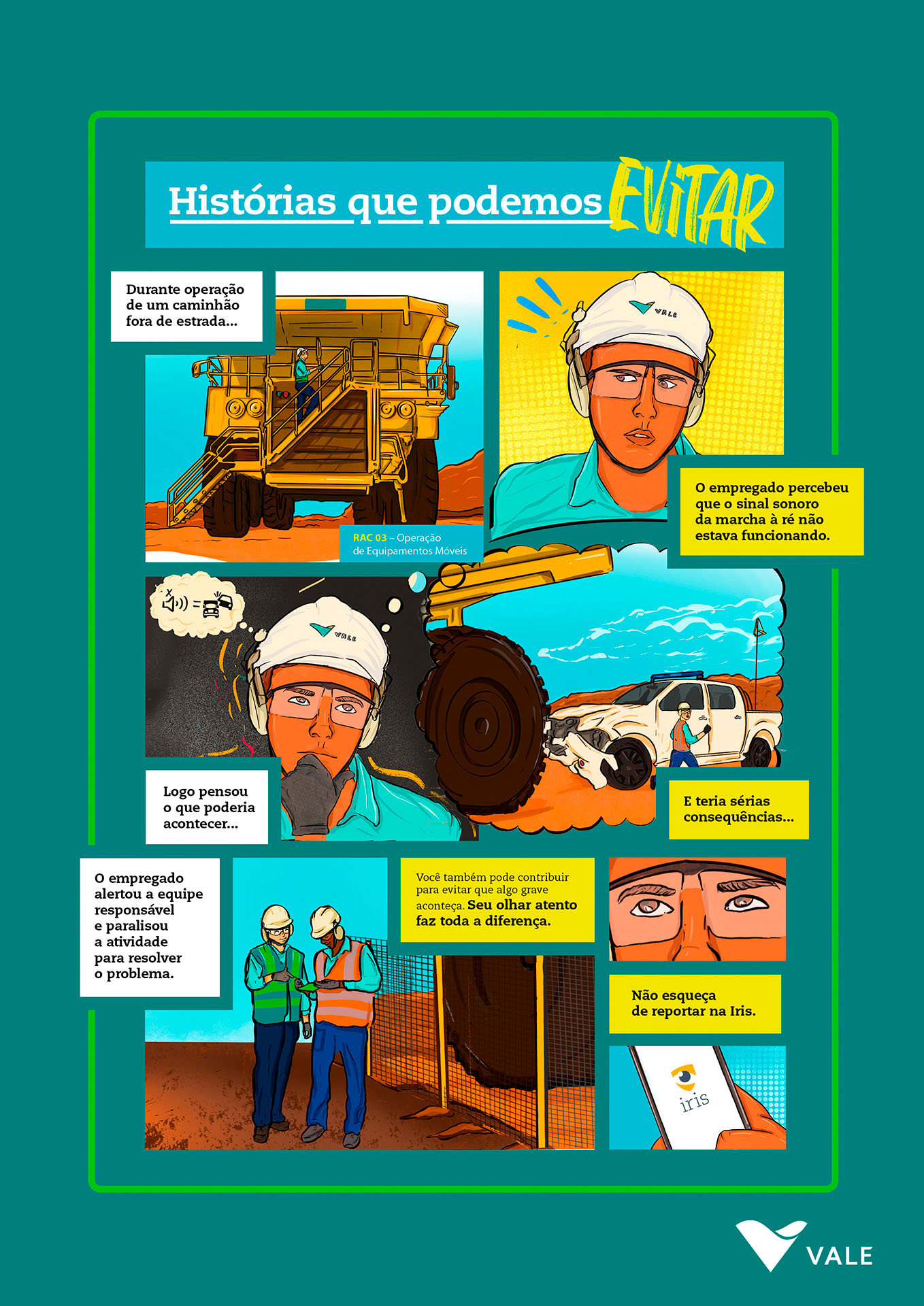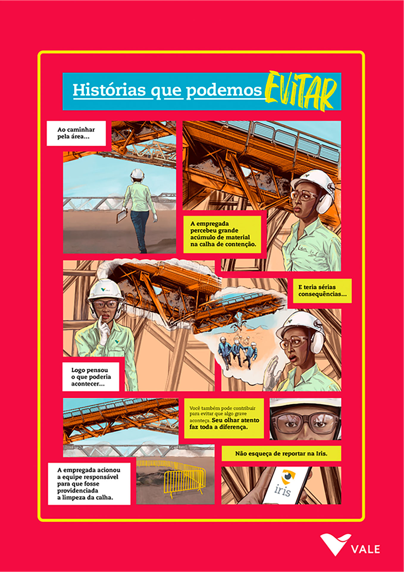 | Resumo do Desafio e da Solução: Junto às equipes da Vale Global, era preciso abordar a importância de identificar corretamente casos de acidentes que não geraram lesões graves ou fatais, chamados de eventos N3, que dão a chance de tratar problemas antes que algo crítico aconteça. Pronto, o problema era esse: era muito difícil explicar. E sabe o que a gente fez para facilitar? Resolvemos desenhar. Criamos uma plataforma de conteúdo em HQ, com histórias baseadas em fatos reais. |