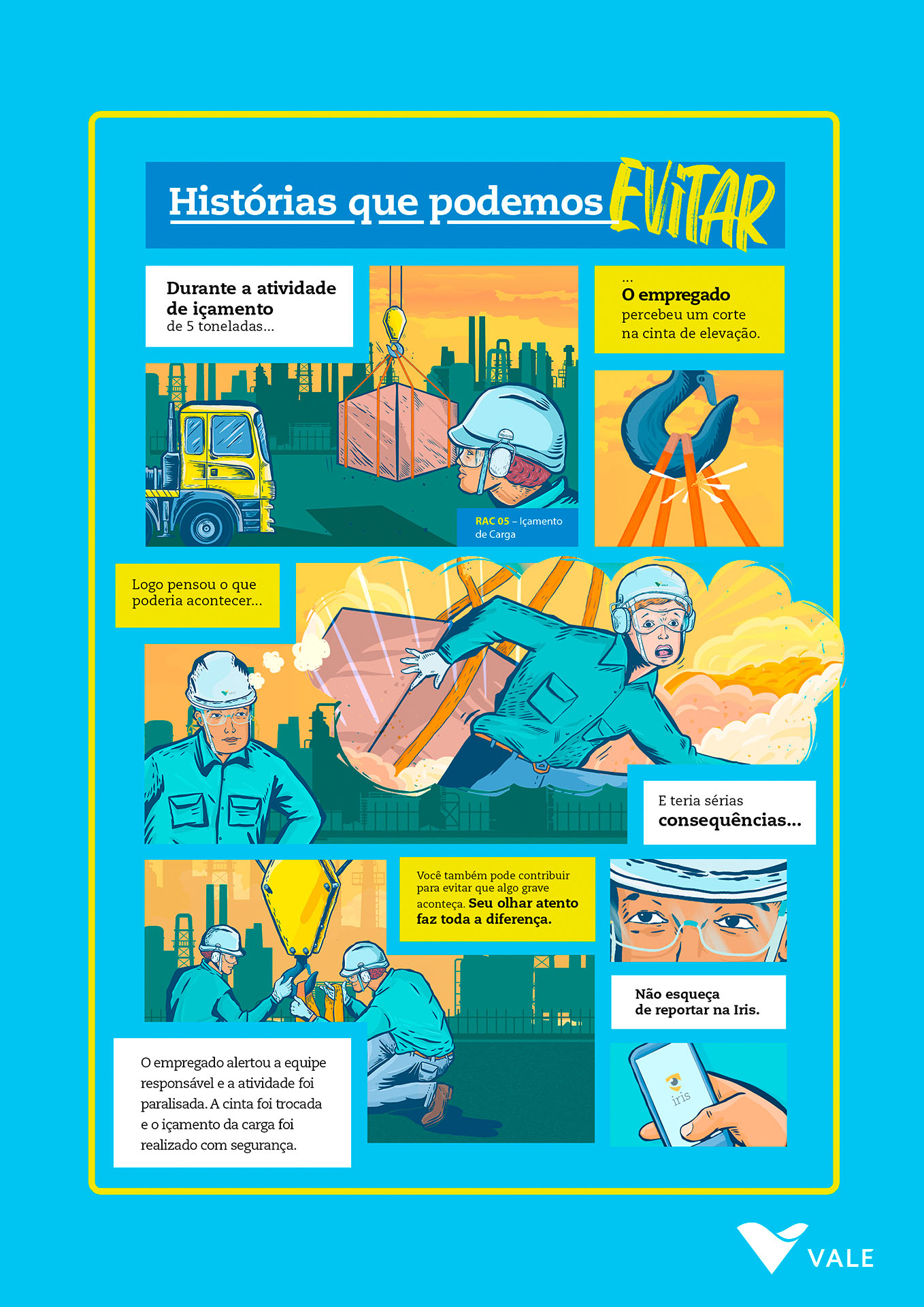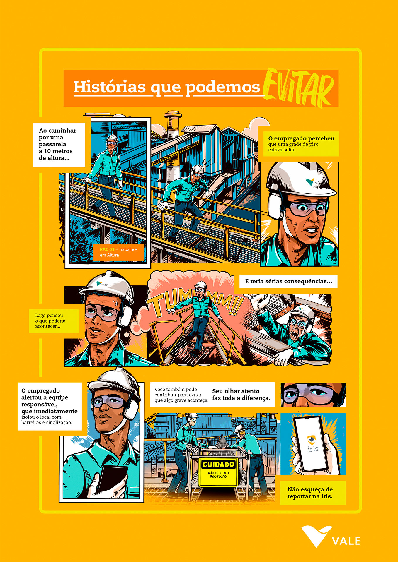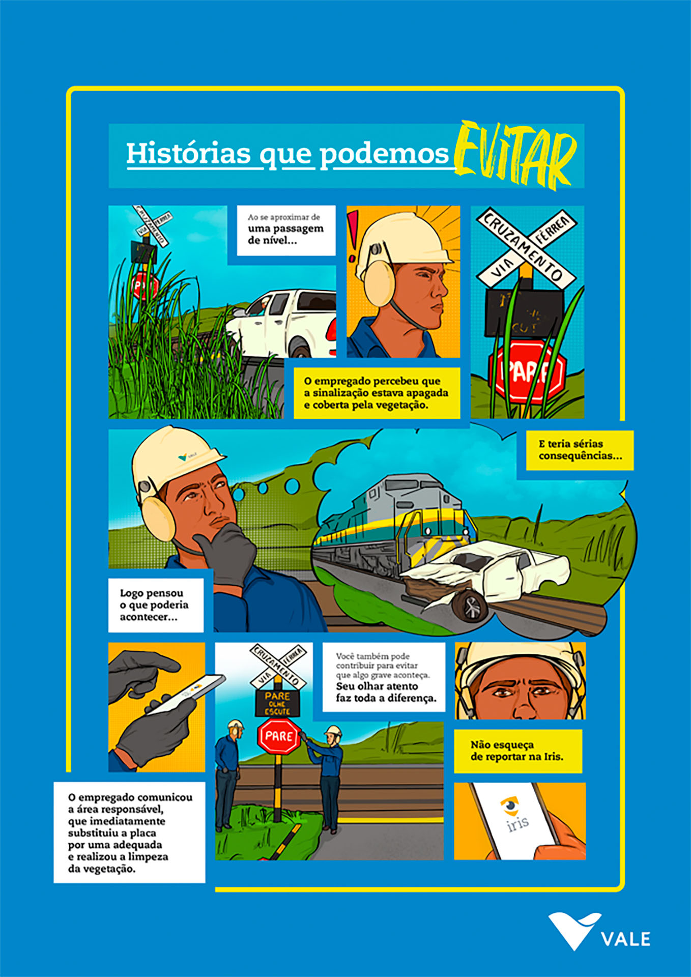 | Resumo do Desafio e da Solução: Junto às equipes da Vale Global, era preciso abordar a importância de identificar corretamente casos de acidentes que não geraram lesões graves ou fatais, chamados de eventos N3, que dão a chance de tratar problemas antes que algo crítico aconteça. Pronto, o problema era esse: era muito difícil explicar. E sabe o que a gente fez para facilitar? Resolvemos desenhar. Criamos uma plataforma de conteúdo em HQ, com histórias baseadas em fatos reais. |