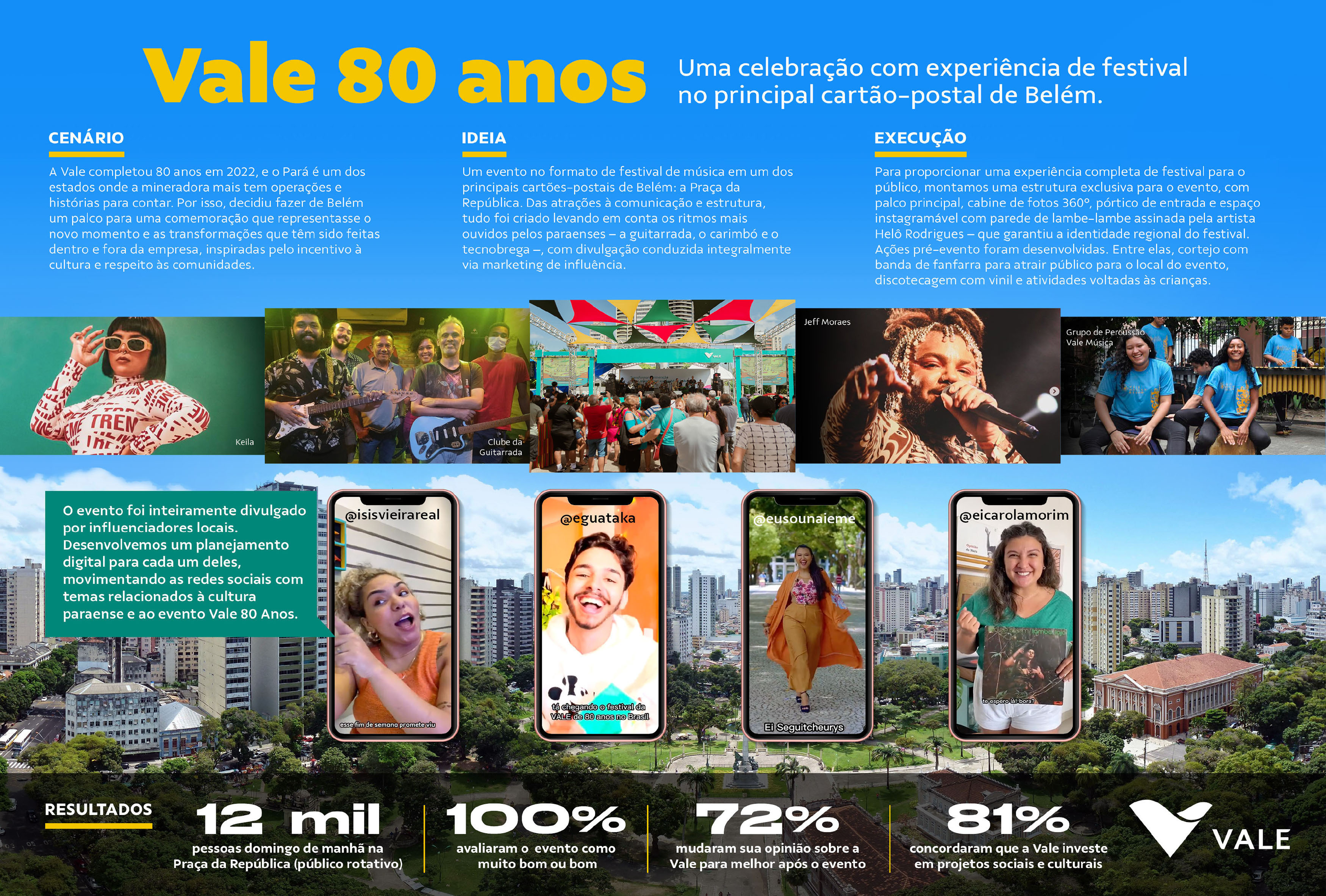 | Resumo do Desafio e da Solução: O Festival Vale 80 anos reuniu uma estrutura exclusiva, artistas paraenses e influenciadores locais na Praça da República, em Belém. Precisávamos transmitir a mensagem da transformação do futuro através da mineração, mostrando as ações ambientais e de incentivo à cultura da Vale. O festival reuniu 12 mil pessoas, contribuindo para a reputação da marca. |