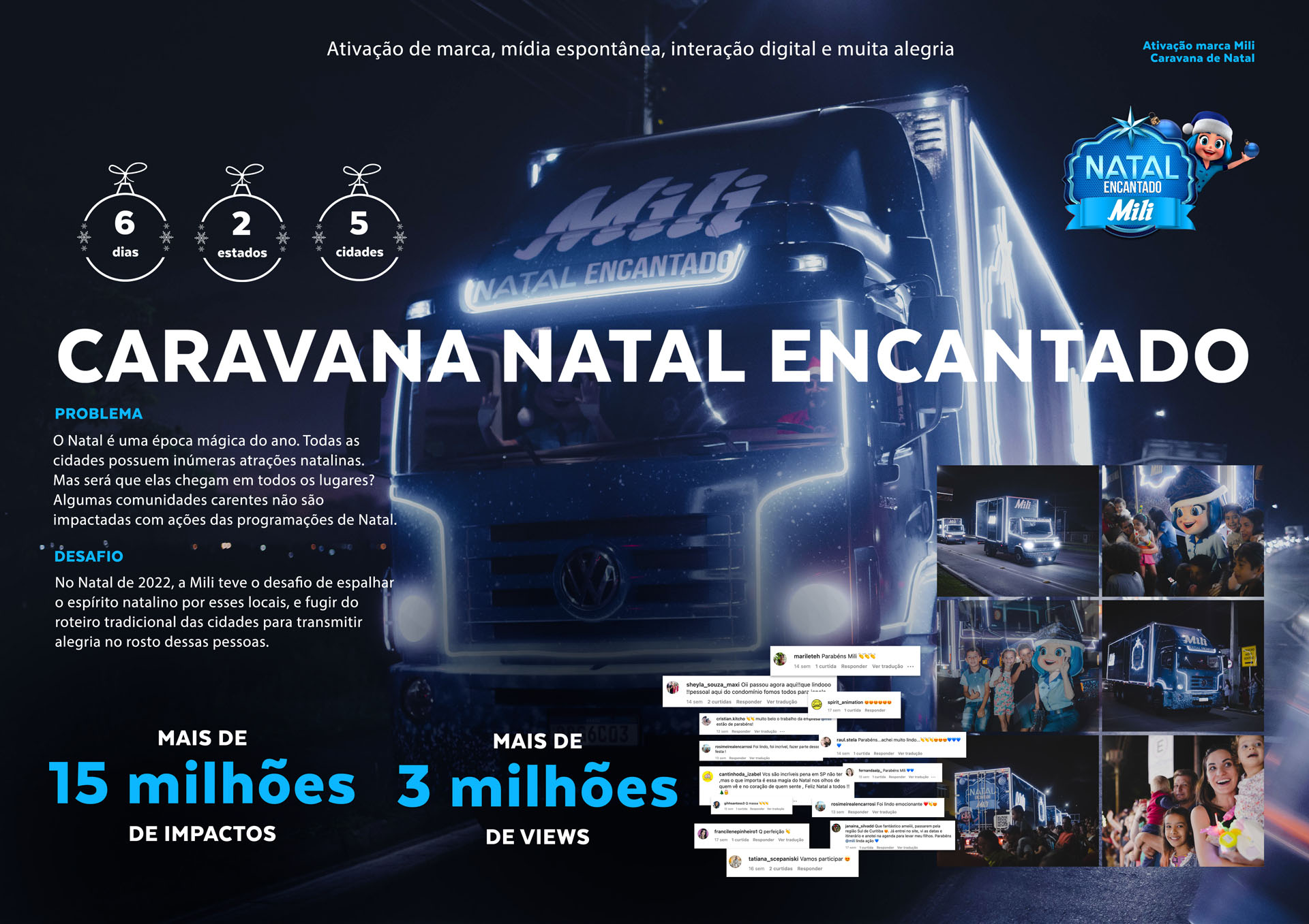 | Resumo do Desafio e da Solução: O Natal é uma época mágica do ano. Todas as cidades possuem inúmeras atrações natalinas. Mas será que elas chegam em todos os lugares? Algumas comunidades carentes não são impactadas com ações das programações de natal. Com isso, no natal de 2022, a Mili abraçou o desafio de espalhar o espírito natalino por esses locais, e fugir do roteiro tradicional das cidades para transmitir alegria no rosto dessas pessoas. |
