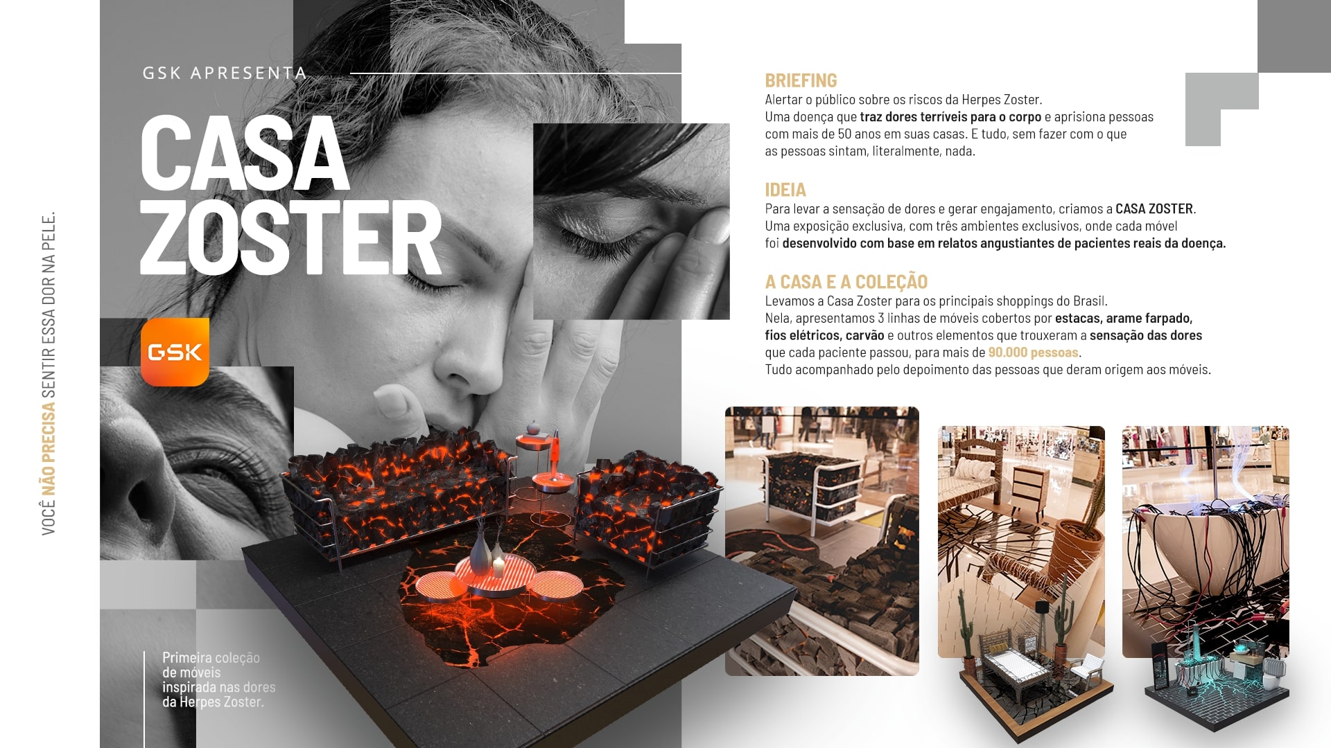 | Resumo do Desafio e da Solução: Como conscientizar sobre uma doença pouco conhecida que afeta com dores terríveis 1 em cada 3 pessoas acima de 50 anos? Criamos a primeira coleção de móveis inspirada nas dores da Herpes Zoster. A Casa Zoster apresentava móveis cobertos por arame farpado, fios elétricos, carvão e elementos que traziam a sensação da doença em cada paciente. A ativação conscientizou mais de 90.000 pessoas. Dessas, 50% nunca haviam ouvido falar da doença. |