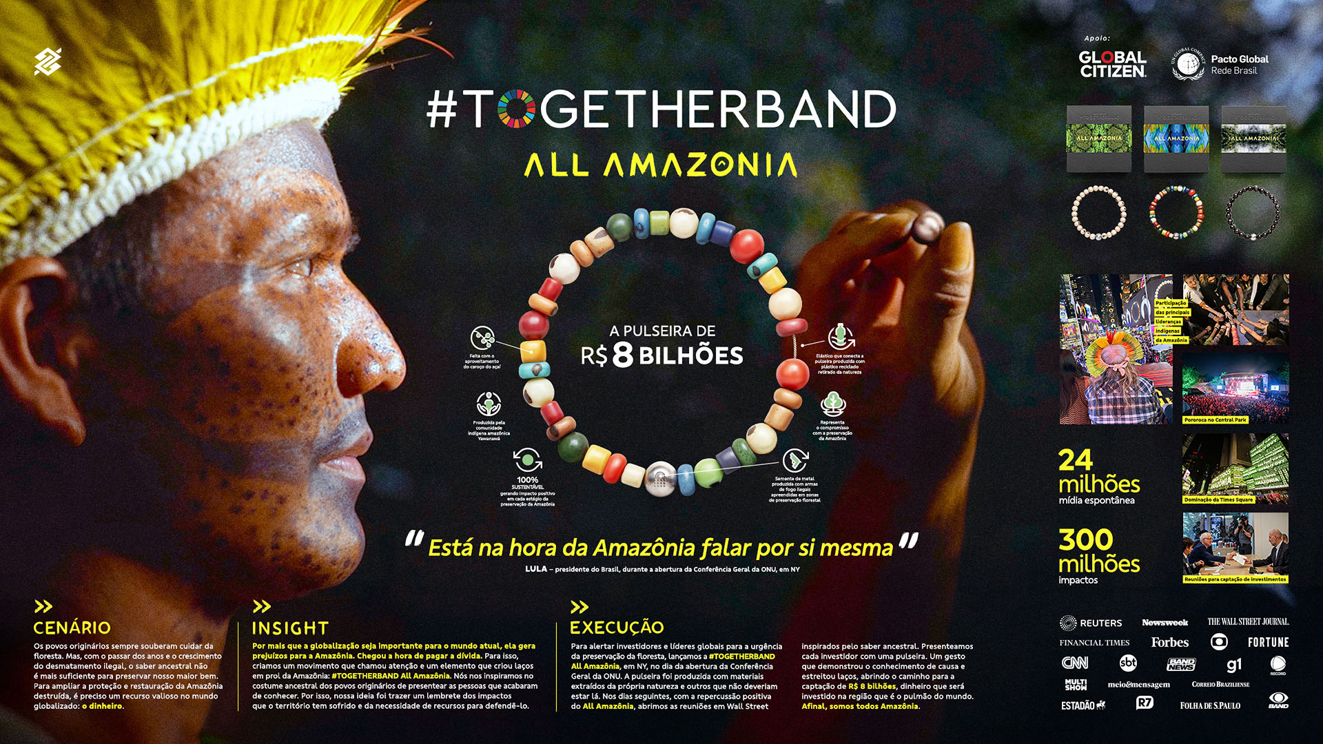 Categoria: Brinde ou Peça Promocional dirigida a Públicos Internos ou Intermediários Agência: TERRUÁ Parceria: WMcCann Ficha Técnica: Direção de Criação: Duda Moreira Salles, Eric Sulzer, Raoni Leão, Coordenador: Thiago Vieira, Cco: Dani Ribeiro. Planejamento: Michelle Borborema e Renata Sampaio, Ricardo Bauab. Redação: Thiago Vieira e Lucas Costa, Raoni Leão. Direção de Arte: Juan Sales e Anselmo Ferreira. Produção Gráfica: Terrua. Produção de RTVC: Camilla Mendes, Lívia Gouveia, Taíta Kuhn, Fabiana Dias, Adriely Holanda. Tecnologia Digital: Bi: Felipe Borges, Luis Paes, Juan Brandão e Arthur Arruda. Ceo: Moisés Gomes, André França, Renata Bokel Vp: Martha Letícia, Patrícia Andrade, Ana Paula Bulus. Negócios: Angela Saliba, Projetos: Nathalia de Brito e Renata Spindola. Estúdio: Cristiano Souza, Murillo Lopes, Pedro Neto, Conteúdo: Josane Muriel. Direção de Produção: Deko Barreto, Camila Naito. Mídia: Andreia Abud, Giuliana Chekin, Glenda Tugumia, Raquel Assunção, Mireille Terra, Anderson Lima,Fernan. Atendimento: Carol Maiorana, Amanda Camelo, Dilma Lima, Viviane Oliveira, Gabriella Miranda, Thais Santos. Produtora de Filme: O2 e Mm Artes Visuais. Direção do Filme: Renato Amoroso. Produtora de Áudio: Áudiotech e S de Samba. Rp: Oficina da Palavra, Pulseira: Bottletop e Yawanawá. Produção Artística: Zion. Ativistas: Angela Mendes; Beka Munduruku; Luiara Borari; Karai Djekupé; Puyr Tembé; Cacique Raoni;. Ativistas: Maial Paiakan; Kaiapó; Cacique Megaron; Txai Surui. Aprovação: Dimac - Diretoria de Marketing do Banco Do Brasil. |