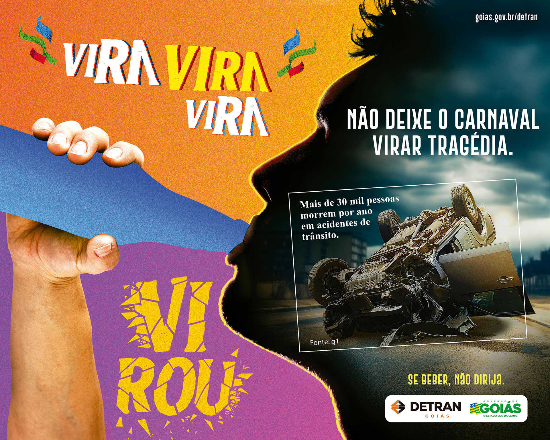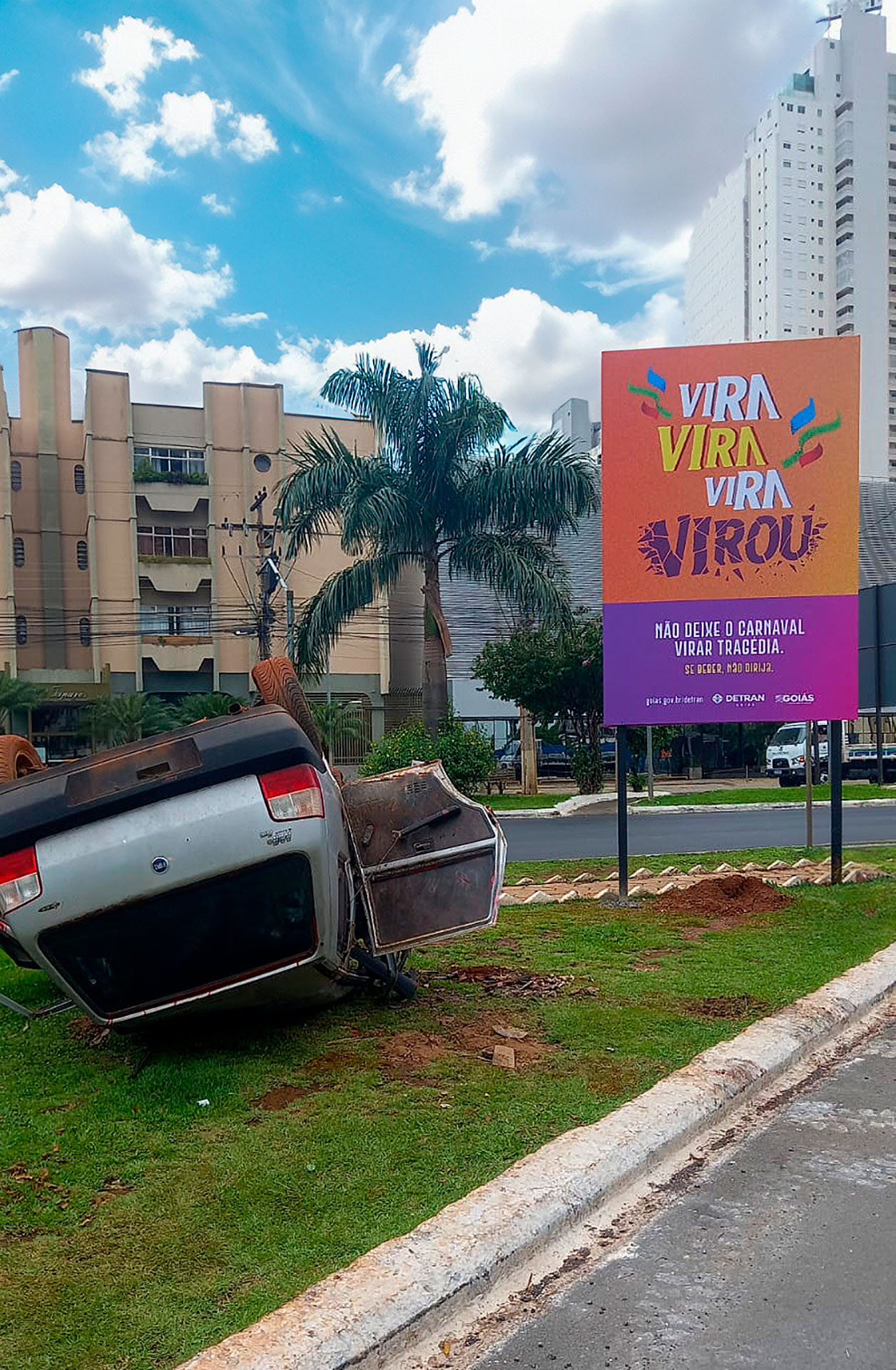 | Resumo do Desafio e da Solução: O Carnaval é marcado pelo risco da combinação entre álcool e direção, resultando em acidentes graves. A Mene e Portella realizou uma intervenção urbana em Goiânia, colocando carros capotados com a mensagem “Não deixe seu Carnaval virar tragédia”. Inspirada na marchinha “Vira, virou”, a campanha teve grande alcance, com ampla cobertura da mídia, tornando-se um dos temas mais comentados do Carnaval 2024. |
