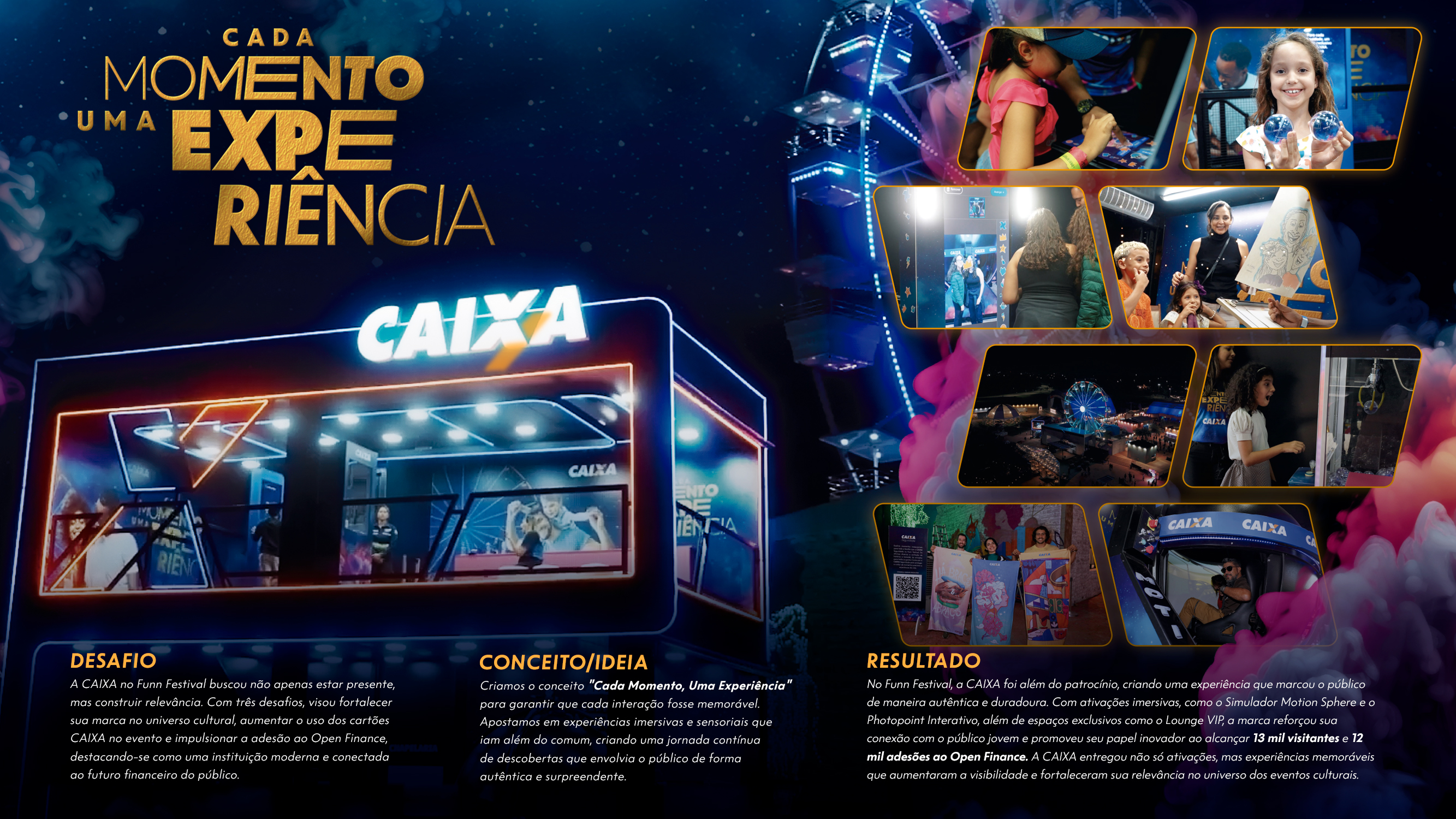 | Resumo do Desafio e da Solução: A CAIXA no Funn Festival buscou não apenas estar presente, mas construir relevância. Com três desafios, visou fortalecer sua marca no universo cultural, aumentar o uso dos cartões CAIXA no evento e impulsionar a adesão ao Open Finance, destacando-se como uma instituição moderna e conectada ao futuro financeiro do público. |