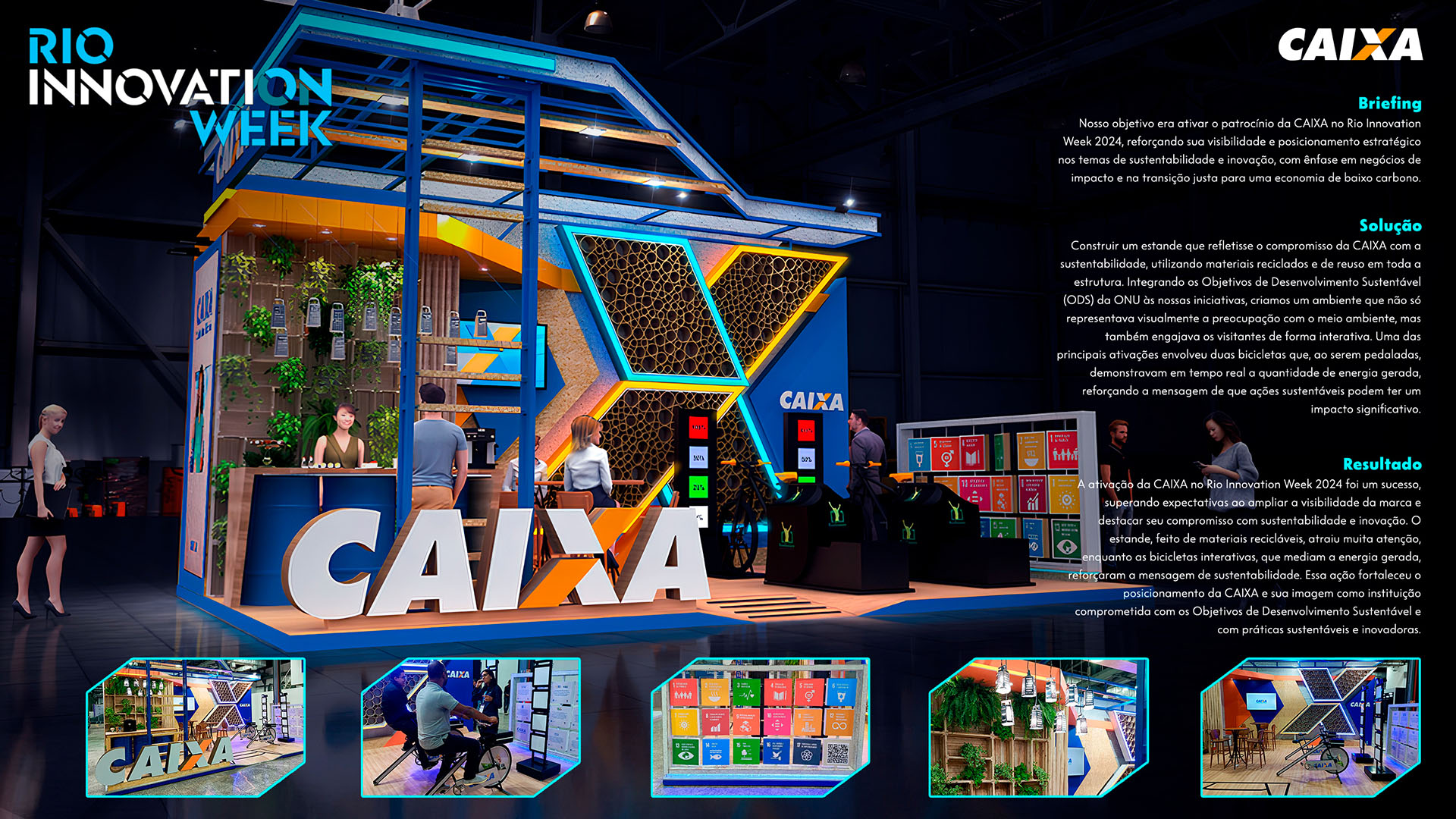 | Resumo do Desafio e da Solução: Nosso objetivo era ativar o patrocínio da CAIXA no Rio Innovation Week 2024, reforçando sua visibilidade e posicionamento estratégico nos temas de sustentabilidade e inovação, com ênfase em negócios de impacto e na transição justa para uma economia de baixo carbono. |