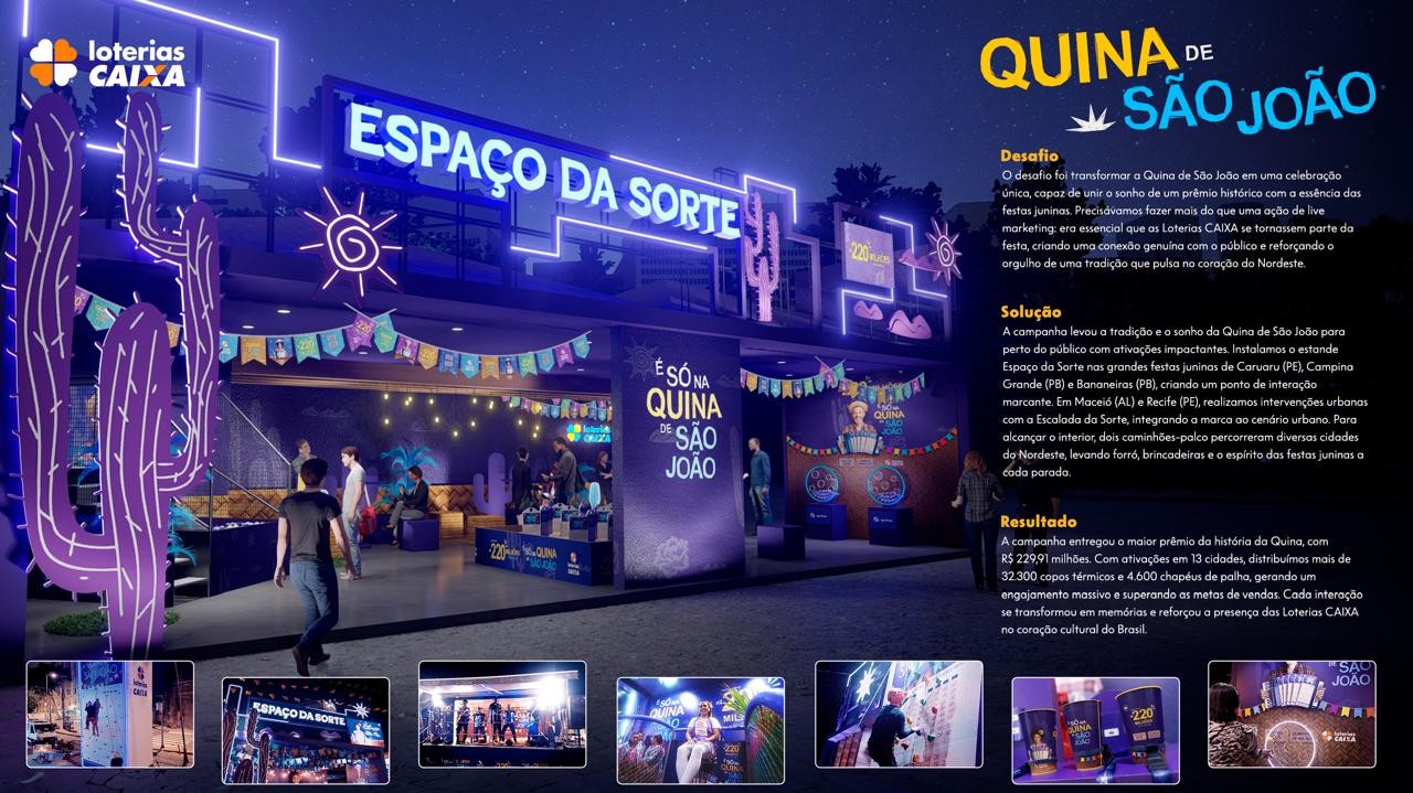 | Resumo do Desafio e da Solução: A Quina de São João 2024 não é só uma campanha, é um momento em que as Loterias CAIXA se encontram com a alma do Brasil. Ao transformar a celebração junina em uma plataforma de sonho e esperança, levamos ao público uma experiência culturalmente viva e emocionalmente envolvente. São as Loterias CAIXA entregando muito mais do que prêmios: entregando brasilidade. |