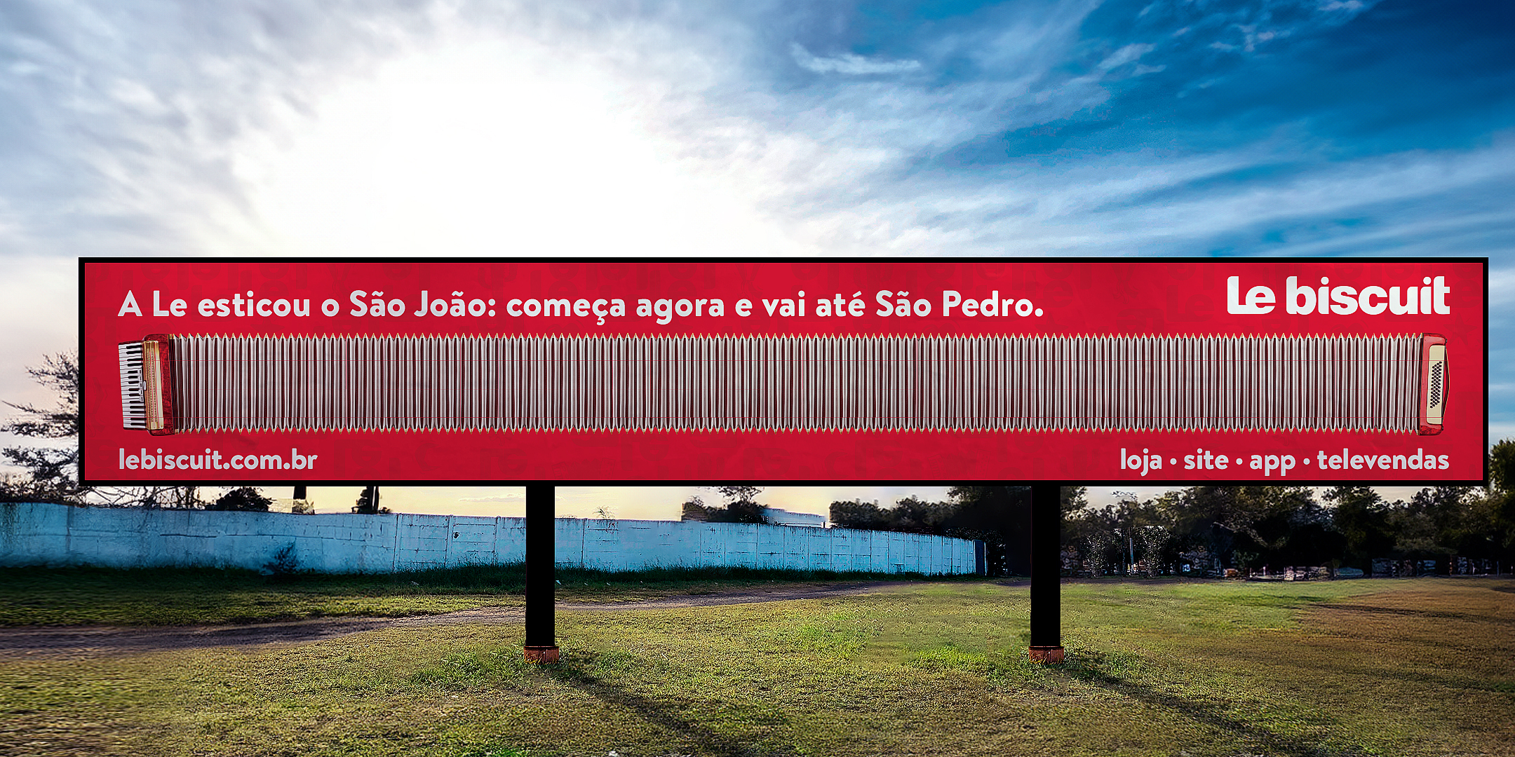 | Resumo do Desafio e da Solução: Le biscuit é uma rede de varejo presente um muitas praças do nordeste, com uma conexão importante com as datas regionais tradicionais. O São João, uma dessas datas mais importantes, precisava comunicar que agora o São João na Le teria uma duração ainda maior, começando antes e terminando depois do período normal, ou seja, seria mais longo. Por isso o outdoor duplo com uma sanfona esticada justamente para passar essa ideia. |