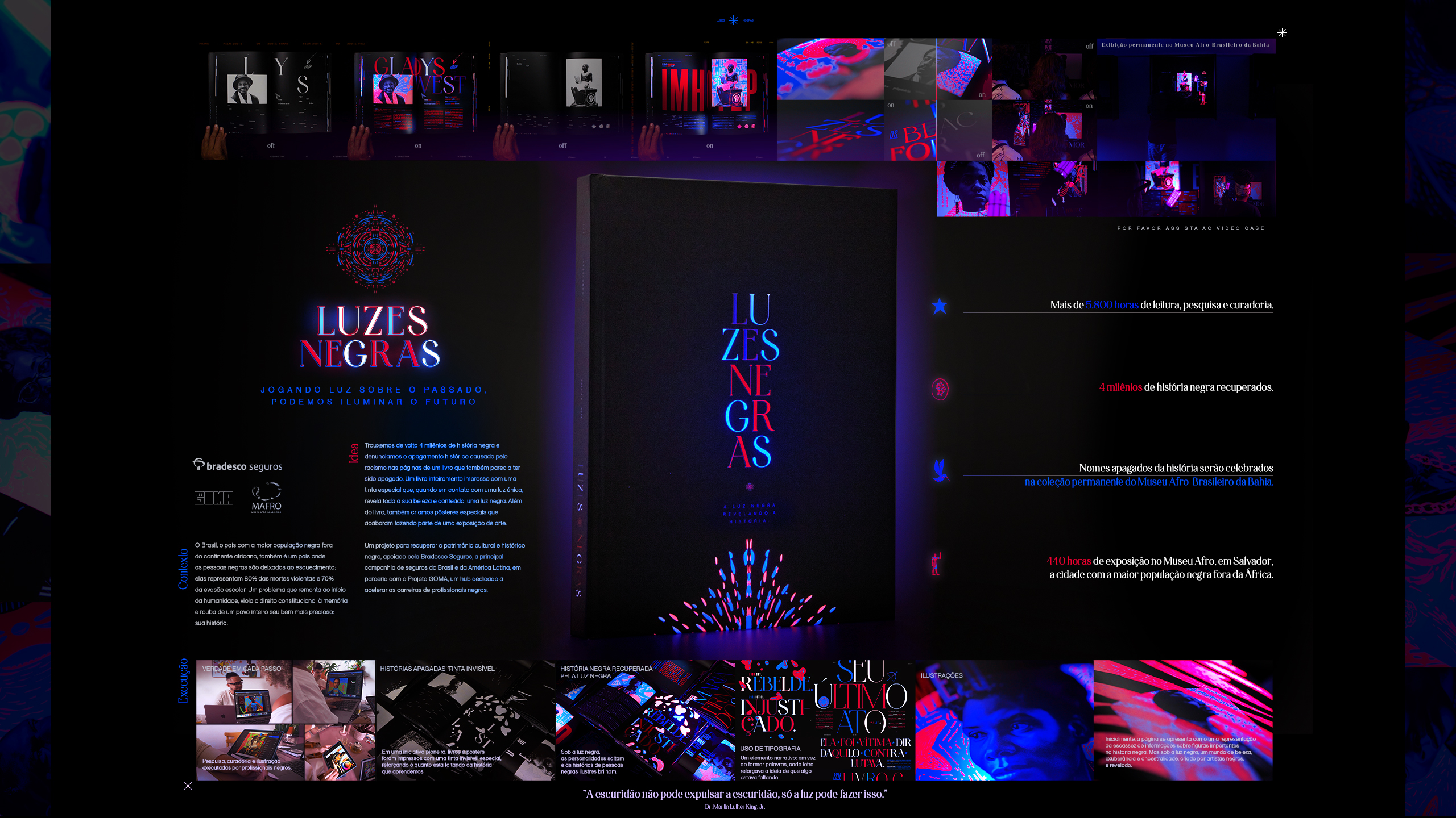 | Resumo do Desafio e da Solução: O projeto "Luzes Negras" resgata histórias de personalidades negras apagadas da narrativa oficial. O livro, escrito com tinta invisível, só pode ser lido sob luz negra, revelando cientistas, pesquisadores e outros nomes célebres. A peça funciona como uma metáfora visual, iluminando histórias esquecidas, sendo tão relevante que suas páginas se transformaram em exposição e foram incluídas no acervo permanente do Museu Afro-Brasileiro da UFBA. |