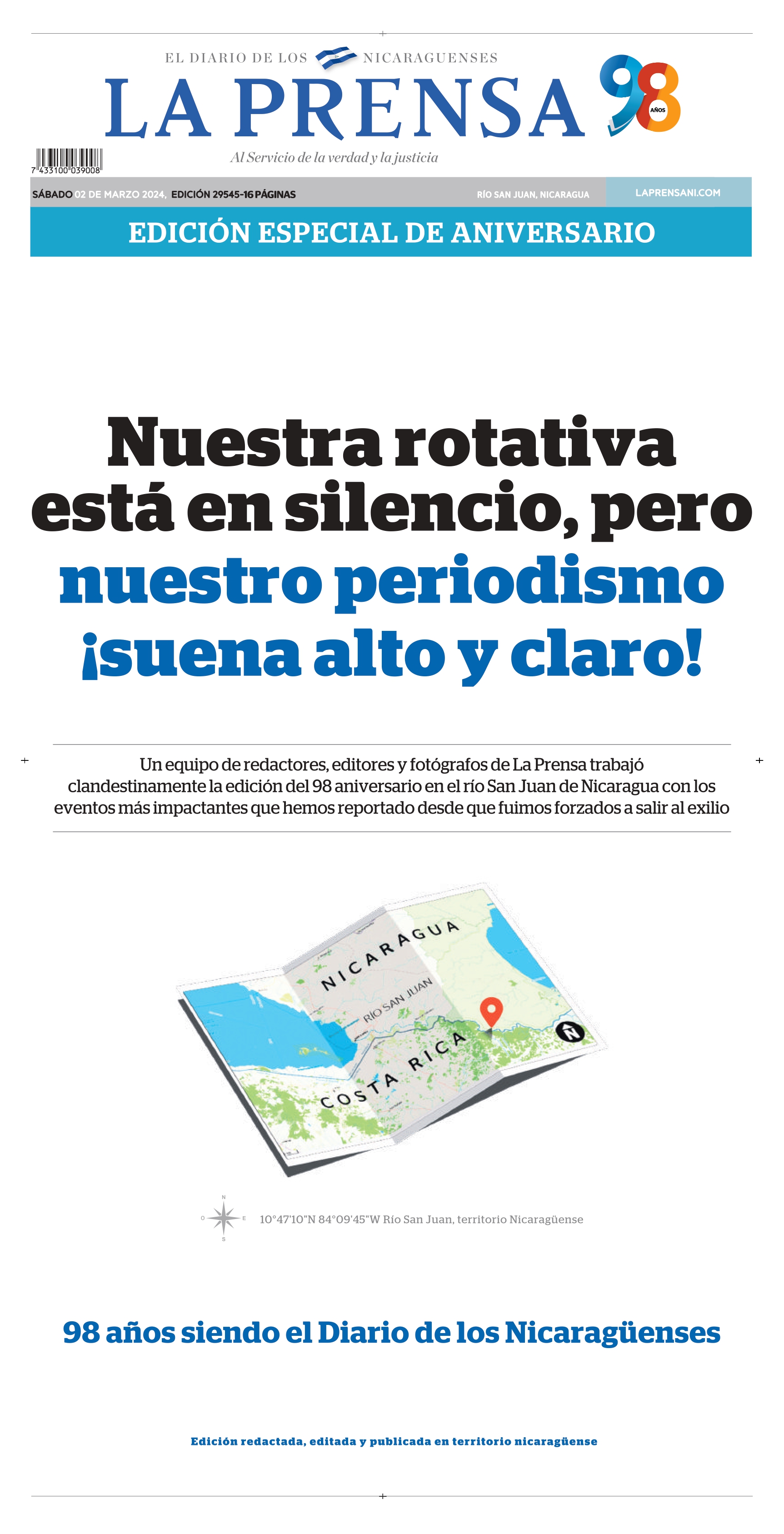 | Resumo do Desafio e da Solução: Três anos após o último jornal impresso na Nicarágua, o La Prensa celebrou seu 98º aniversário devolvendo o direito à informação aos nicaraguenses. Do exílio, criou a primeira sala de imprensa marítima, usando um barco costarriquenho para publicar uma edição histórica. Distribuída por WhatsApp, Telegram e e-mail, a edição se tornou um protesto, permitindo que cidadãos imprimissem o jornal e exigissem liberdade de imprensa no Dia do Jornalista. |