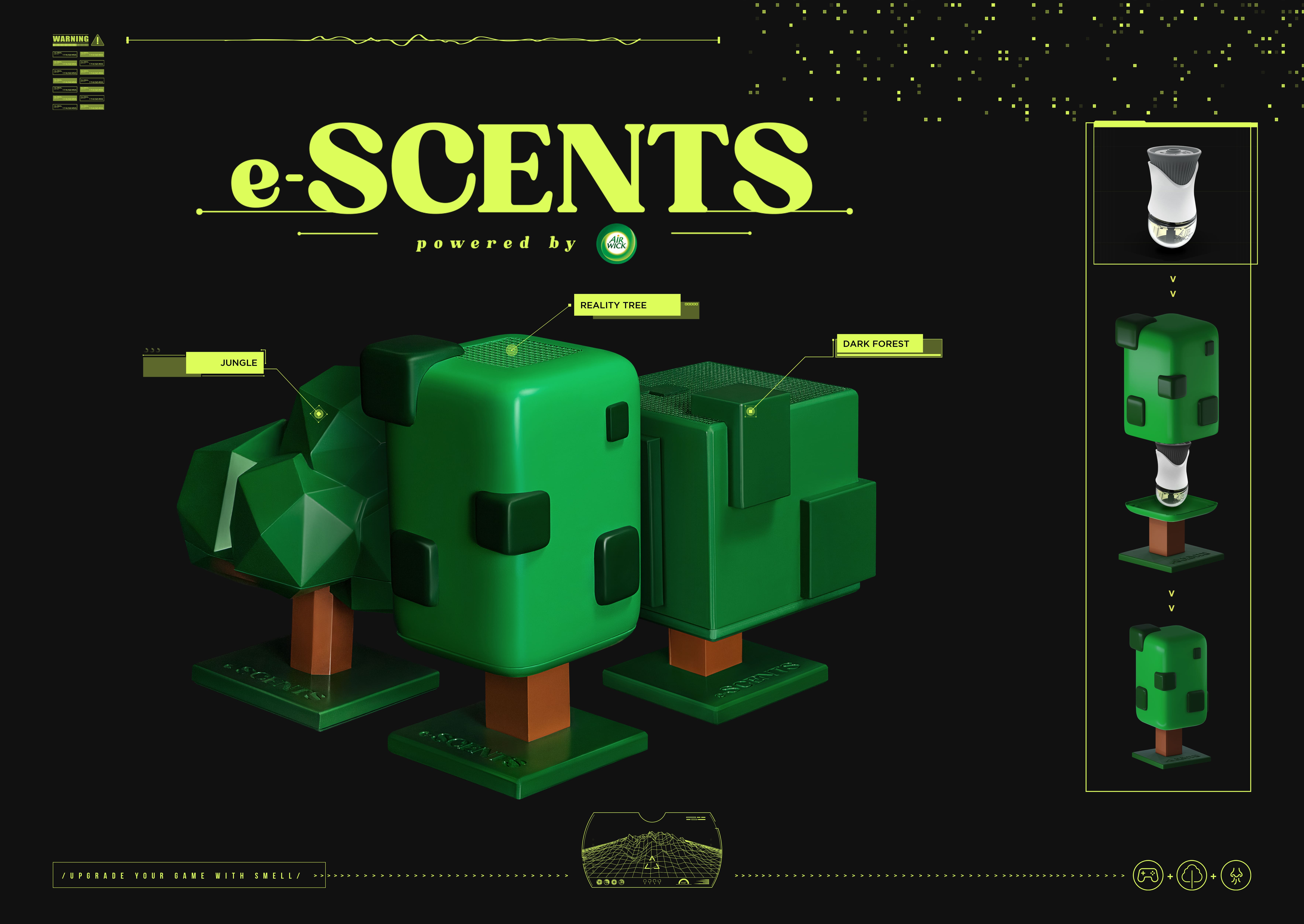 | Resumo do Desafio e da Solução: e-Scents é um aromatizador criado para enriquecer a experiência dos gamers ao perfumar o ambiente com fragrâncias que combinam com as paisagens dos jogos. Foram criados três difusores, inspirados nas árvores mais icônicas dos games, que também funcionam como decoração. Atendendo aos pedidos, compartilhamos os designs no Thingiverse para quem quisesse baixar e imprimir em 3D. E teve até gente vendendo versões mais baratas em mercados de rua. |